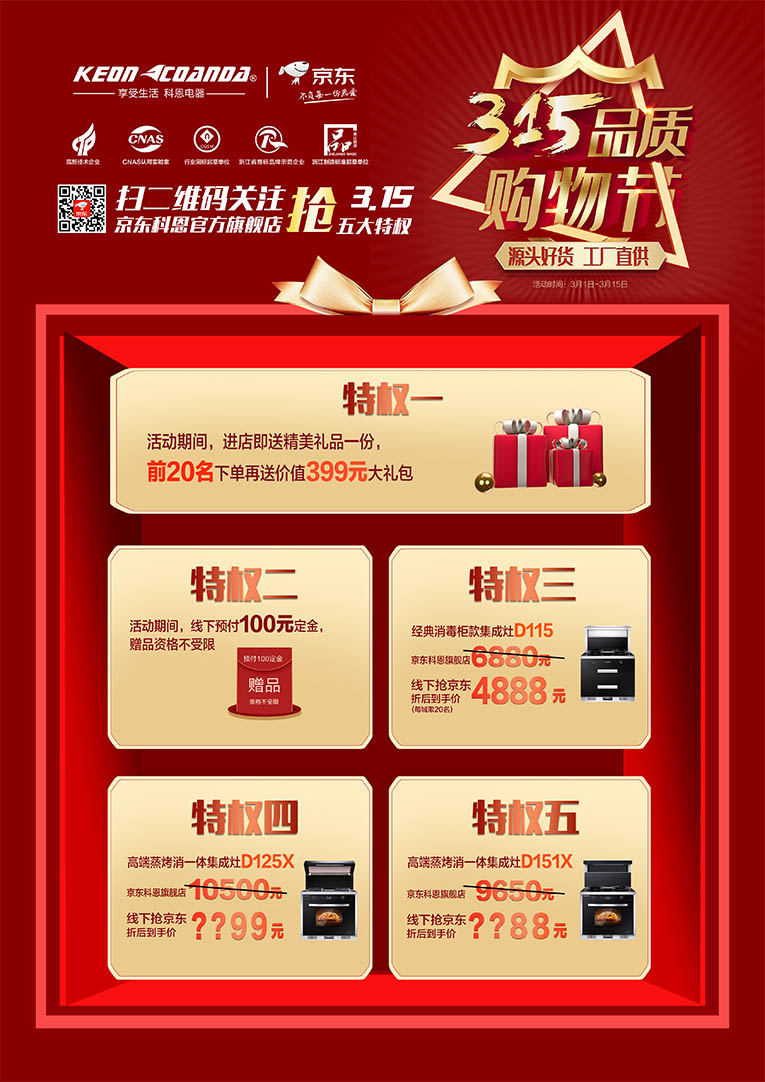 還在等什么呢?集成灶十大品牌、廚電行業(yè)十大品牌科恩電器“315品質(zhì)購物節(jié)”為你全程護(hù)航,讓您放心買,安心用,全國(guó)2100余家各大專賣店同步進(jìn)行,期待您的參與!