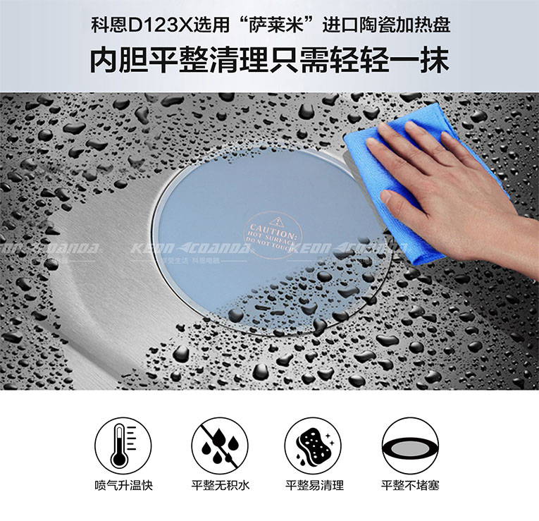 值得一體的是,集成灶十大品牌、廚電行業十大品牌科恩D123X蒸烤消一體變頻大吸力集成灶蒸箱采用噴氣式4D立體蒸,薩萊米陶瓷加熱盤,避免了蒸盤在蒸制過程中排水孔容易堵塞導致的故障,D123X蒸烤消一體集成灶噴氣升溫快、平整無積水、易清理、不堵塞,內膽平整清理只需輕輕一抹就能潔凈。