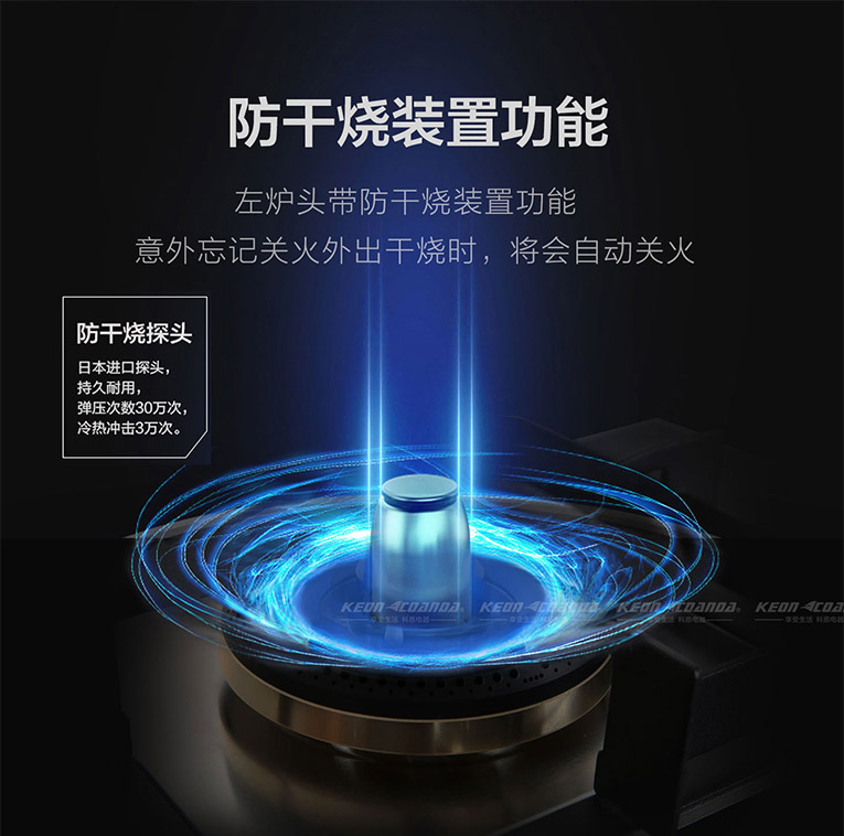 科恩猛火勁灶智能防干燒灶具KN610創(chuàng)新科技,在工藝、設計、選材上都非常考究,5.0KW大火力精控勁火,能在短時間內(nèi),激發(fā)食物深層營養(yǎng)分子,讓食材呈現(xiàn)出最佳的狀態(tài),尤其在爆炒上,能使食物味道更加鮮美,感受原汁原味的美食!另外,集成灶十大品牌、廚電行業(yè)十大品牌科恩KN610智能防干燒灶具擁有多重安全防護,8MM厚黑晶防爆鋼化玻璃面板,易清潔、壽命更長;鑲嵌天合金防滑按鈕,工藝精湛、材質(zhì)細膩的同時還具有防升溫效果。KN610灶具最大安全防護在于左爐頭帶防干燒裝置功能,日本進口探頭設計,意外忘記關火外出干燒時,將會自動關火,同時烹飪狀態(tài)下,溫控探頭檢測不到鍋具離鍋60S自動熄火,有效杜絕了安全隱患!