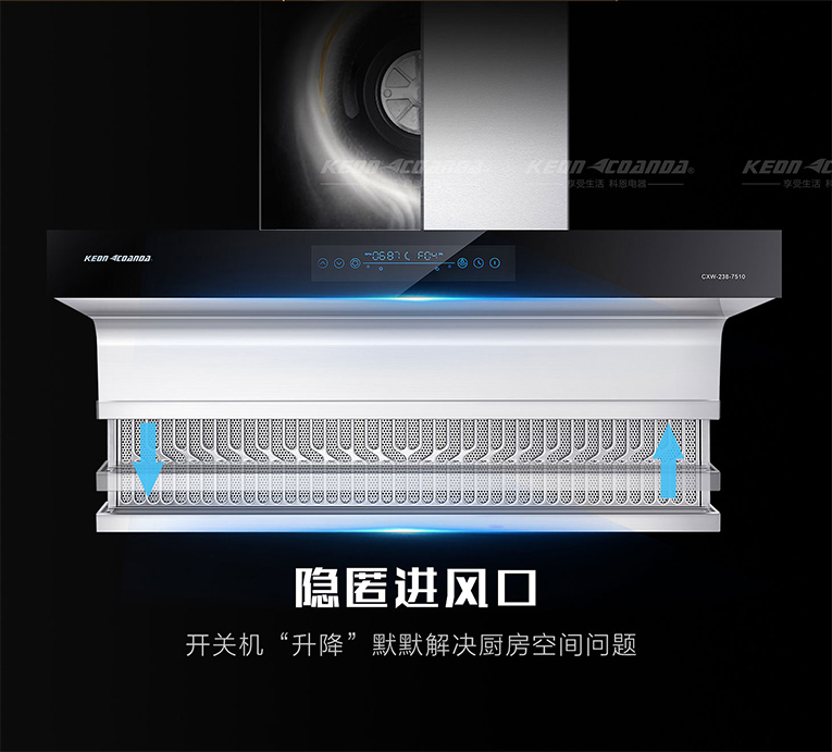 油煙機除了大吸力,從源頭把油煙控制住,不給任何逃逸的機會才是關鍵!想要實現無煙廚房,煙機的吸排是關鍵,集成灶十大品牌、廚電行業十大品牌科恩變頻大吸力智能體感操控煙機從吸排進行突破,低位凈細直排系統,速吸速排,強勁吸力帶來高效吸凈效果!為了達到精準的控煙效果,科恩變頻大吸力智能體感操控煙機采用立體風場18.5m3/min大吸力,有效聚攏凈吸,打造油煙防護墻!另外7510擁有現代化自動升降科技感,開關機“升降”默默解決老廚房空間問題!