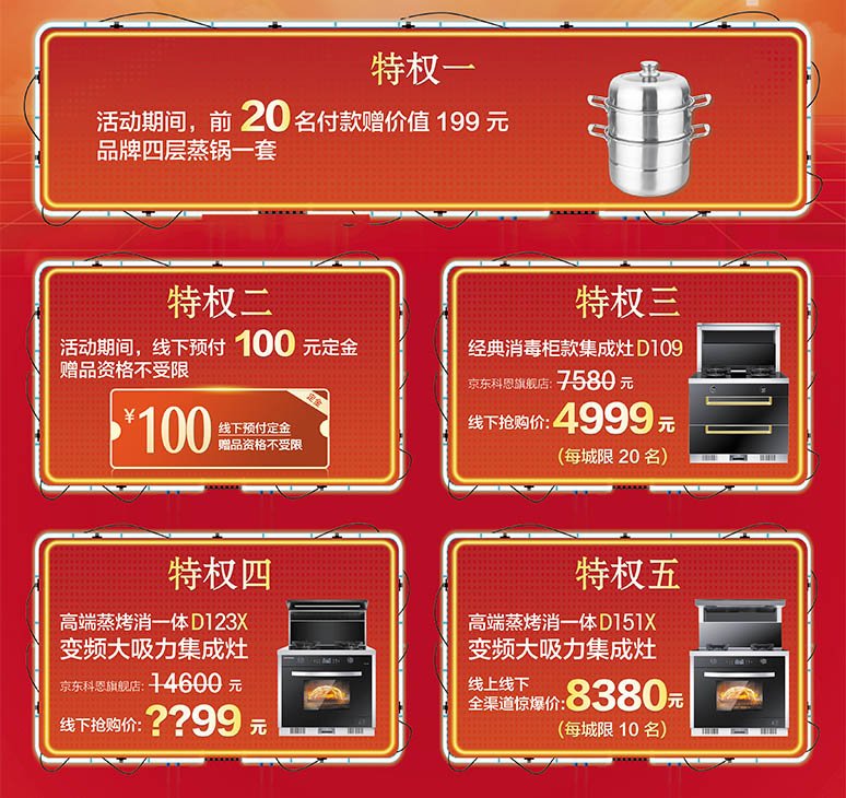 科恩電器一直倡導(dǎo)“樂享智慧烹飪”,本次活動(dòng)也將以“集成智慧廚房”為宗旨,將活動(dòng)產(chǎn)品鎖定與高端產(chǎn)品上。據(jù)悉,本次集成灶十大品牌、廚電行業(yè)十大品牌科恩電器攜手京東商城五一狂歡活動(dòng),只為讓一直以來支持科恩電器的消費(fèi)者花最少的錢購(gòu)到心儀的集成灶,五大特權(quán)優(yōu)惠、搶名額、搶補(bǔ)貼,超劃算的活動(dòng)肯定讓你心動(dòng)。