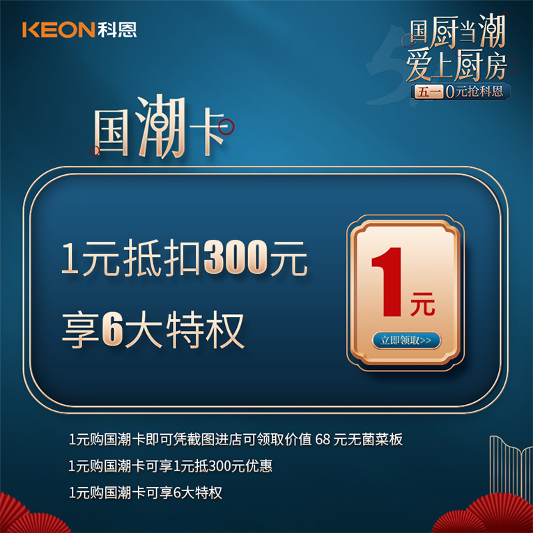 1元國潮卡,限時搶購!購買1元國潮卡,憑截圖即可進店領(lǐng)取價值68元無菌菜板、1元抵300元優(yōu)惠,同時,可享六大特權(quán)!