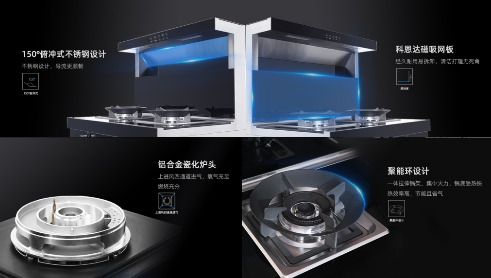 150°俯沖式不銹鋼設計,導流更輕松,排煙更順暢,科恩達磁吸網板,耐用易拆卸,清潔打理360°無死角,鋁合金磁化爐頭+一體拉伸聚能環(huán)設計,受熱更均勻,氧氣更充足,燃燒更充分。