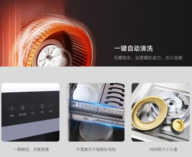 貼心細節(jié),匠心呈現:一鍵自動清洗功能,無需加水,內部快速去污,還原煙機動力,歷久彌新。