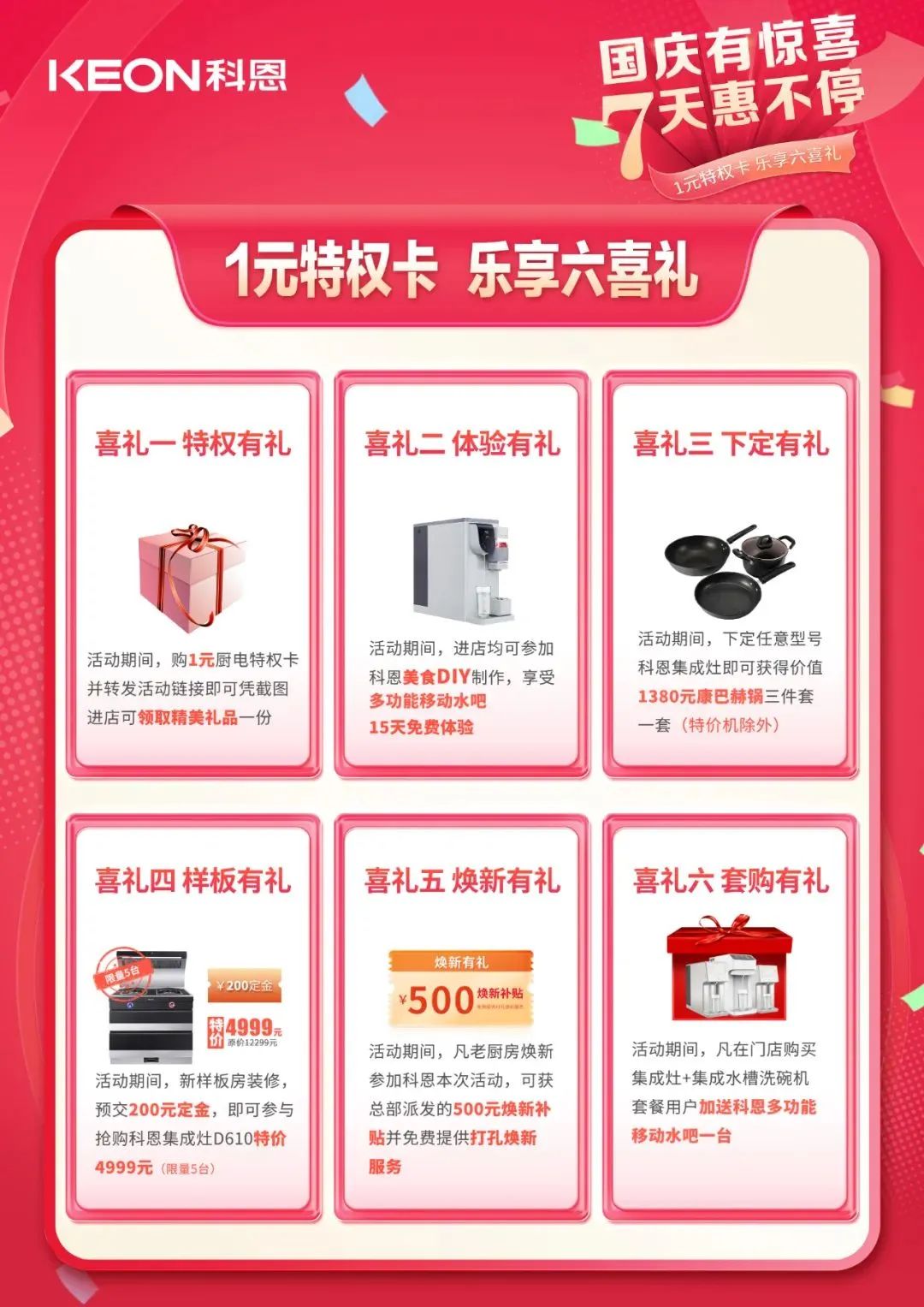 ✔ 1塊錢能干什么?在科恩集成灶,花1元即可享廚電特權卡權益,獲得驚喜禮品一份!同時還能享受科恩多功能移動水吧15天免費體驗優先使用權!