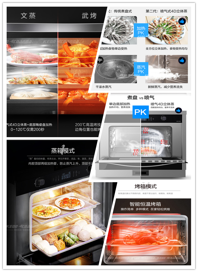 與此同時,科恩集成灶采用側吸下排的方式,嚴格把握10-20cm黃金攏煙區,吸力直逼煙源,截斷油煙路徑,內置直流變頻電機,油煙吸盡系統,提供澎湃動力,爆吸技術高達21m3/min,吸煙能力更強,煮婦(夫)們再也不用天天和油煙“戰斗”。更值得一提的是,科恩集成灶實用性特別強,如科恩智能蒸烤消一體集成灶擁有62L黃金容量空間,四層蒸烤架設計,一次可蒸制一桌菜,多種蒸烤模式隨心選擇,甜品、點心、烤雞等美食想吃就吃。科恩智能蒸烤消一體集成灶采用4D立體直噴蒸烤模式,更能精準控溫,蒸汽動態平衡技術保證多種食材同時烹飪不串味,外置隱藏式水箱,輕輕一按即可自動彈出,加水更方便省心,有了TA煮婦(夫)們做飯不再手忙腳亂,輕松烹飪一桌大餐!