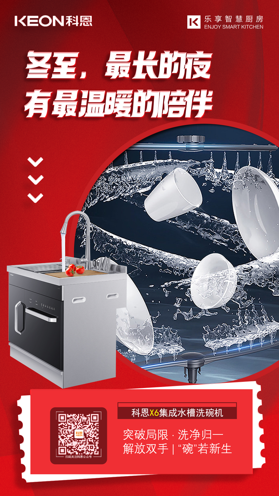科恩集成水槽洗碗機(jī),洗消烘存儲(chǔ)于一體,五大清洗模式,洗果蔬,去農(nóng)殘,洗海鮮亦可輕松搞定!噴淋式循環(huán)系統(tǒng),瀑布式上下雙臂噴淋,全覆蓋高壓沖刷,高效除污自動(dòng)烘干,解放雙手,“碗”若新生!
