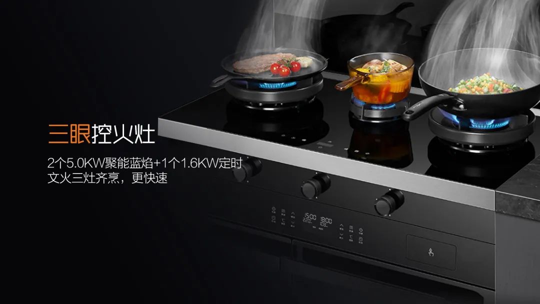 科恩A3系列獨特的三眼控火灶設置,可完美適配三代同堂家庭,25.0KW聚能藍焰+11.6KW定時文火,同時滿足爆炒和煮輔食的需求。且1.6KW小火慢煮,讓輔食擁有自己的專屬火力,無需費力調整,開啟就是最佳火力。