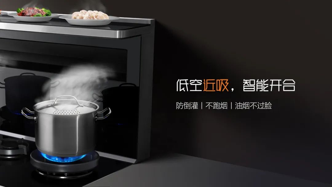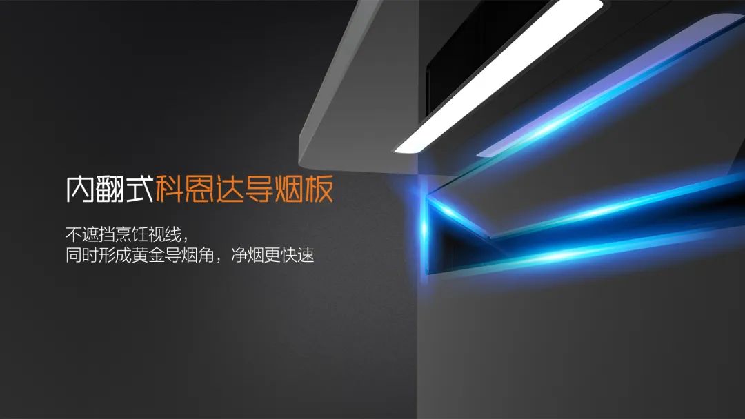 特有的內傾科恩達導煙網板不遮擋視線,且形成獨特的吸煙黃金角,讓油煙在鍋口就被吸走,0跑煙,廚房更清新!