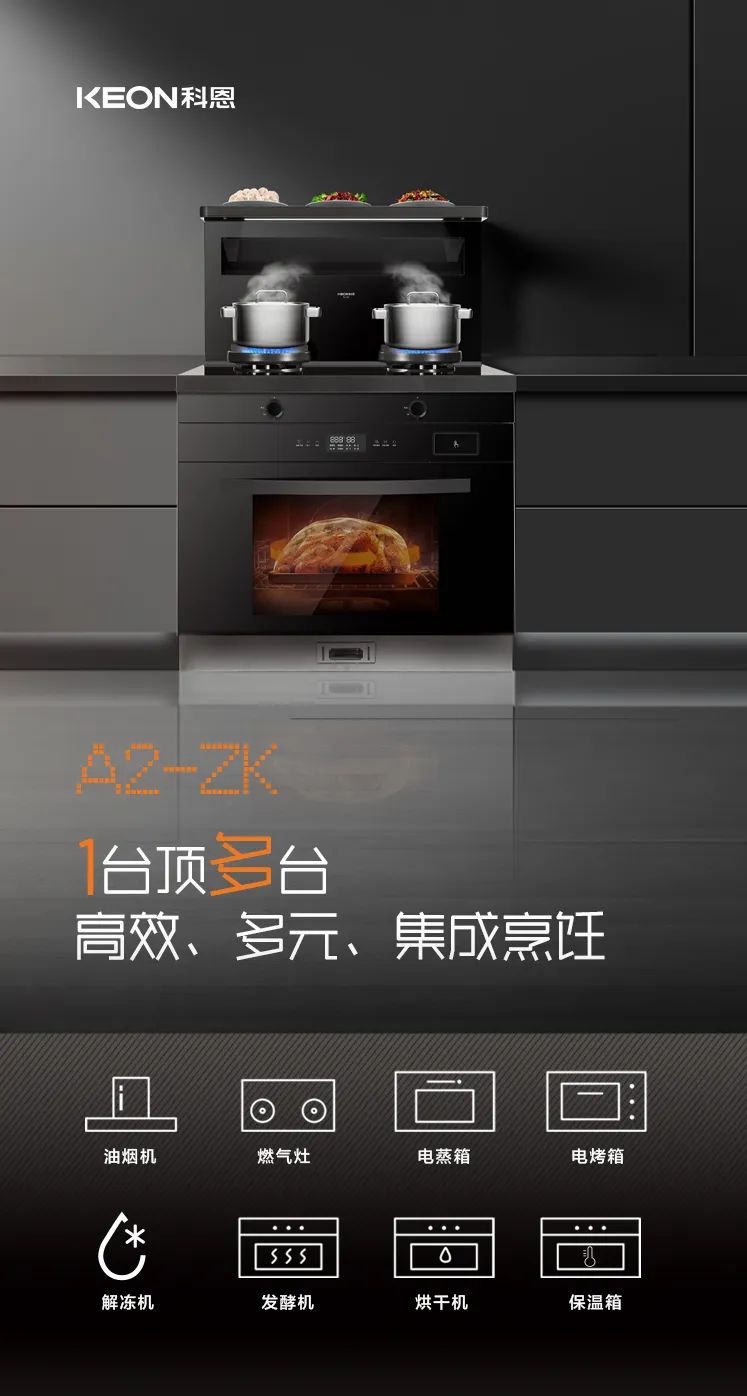 科恩A2蒸烤一體集成灶,集油煙機、燃氣灶、電蒸箱、電烤箱、解凍機、發酵機、烘干機、保溫箱,8臺一體。一平方就籠絡了整個廚房電器,大幅度節省了廚房空間,廚房再也不見凌亂。