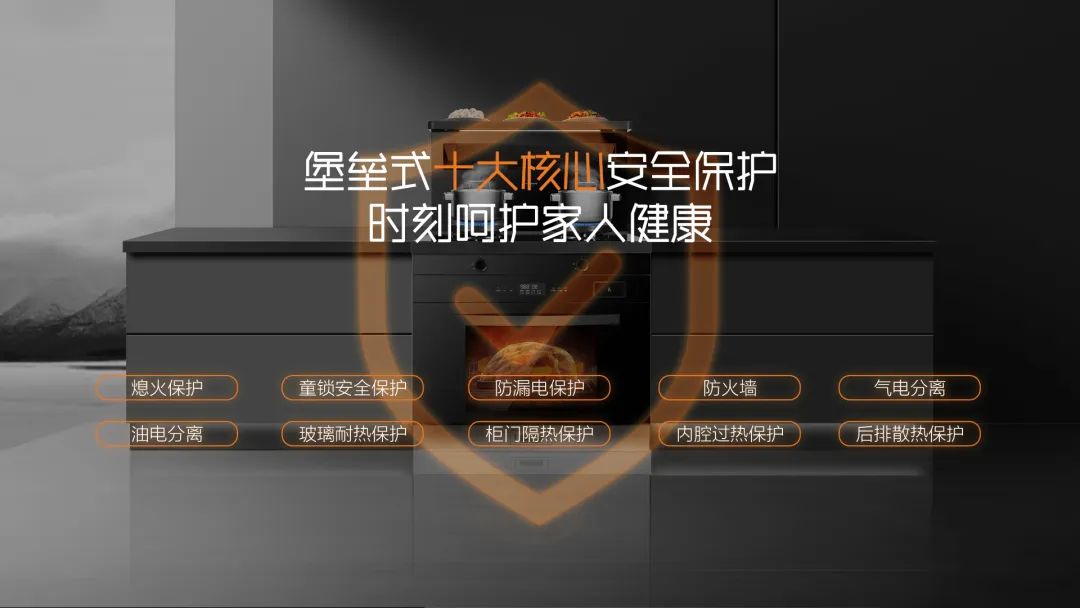 熄火保護、童鎖安全保護、防漏電保護、防火墻、氣電分離、油電分離、玻璃耐熱保護、柜門隔熱保護、內腔過熱保護 、后排散熱保護