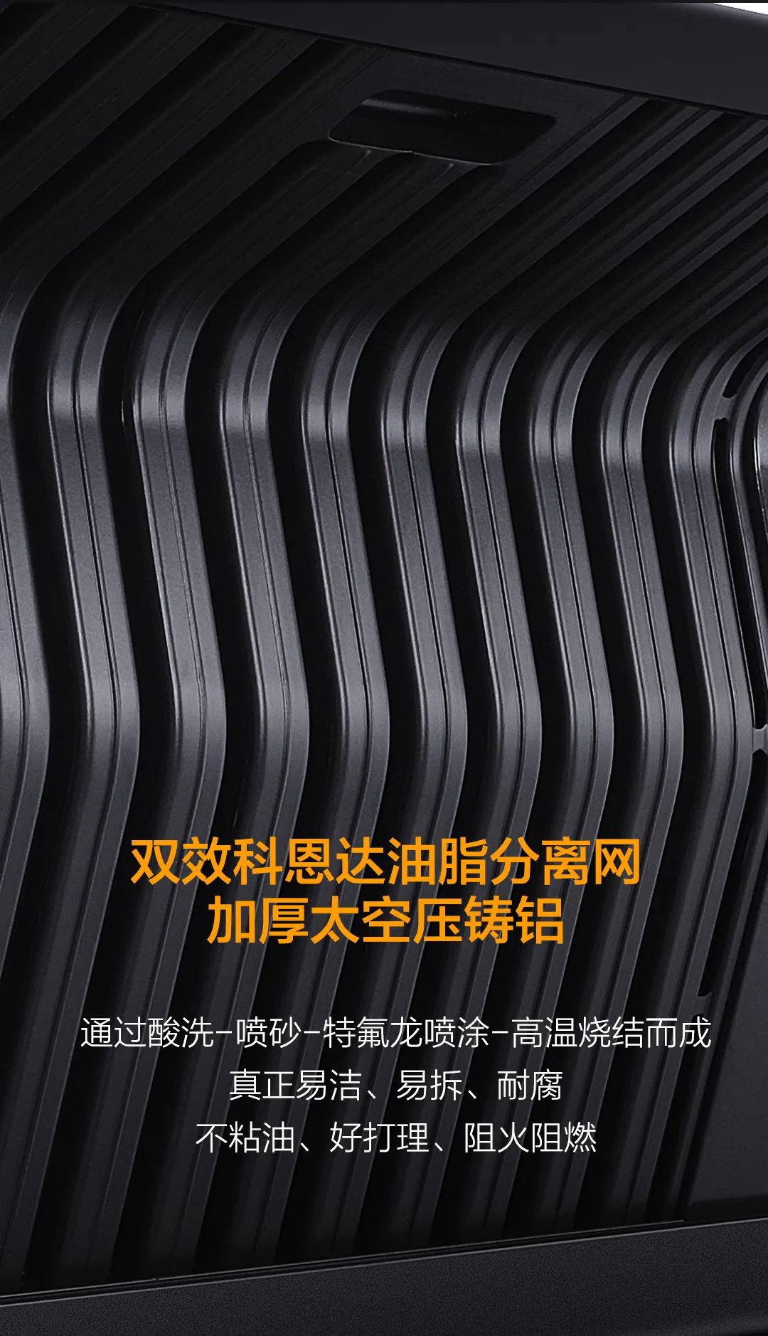 在工藝上經(jīng)過(guò)酸洗-噴砂工藝加之特氟龍噴涂最后高溫?zé)Y(jié),不僅不沾油、易清潔好打理。在分離油煙的同時(shí),還能阻燃阻熱!保障廚房安全!