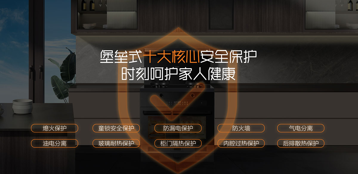 堡壘式十大核心安全保護,時刻呵護家人健康(熄火保護、童鎖安全保護、防漏電保護、防火墻、氣電分離、油電分離、玻璃耐熱保護、柜門隔熱保護、內腔過熱保護 、后排散熱保護)