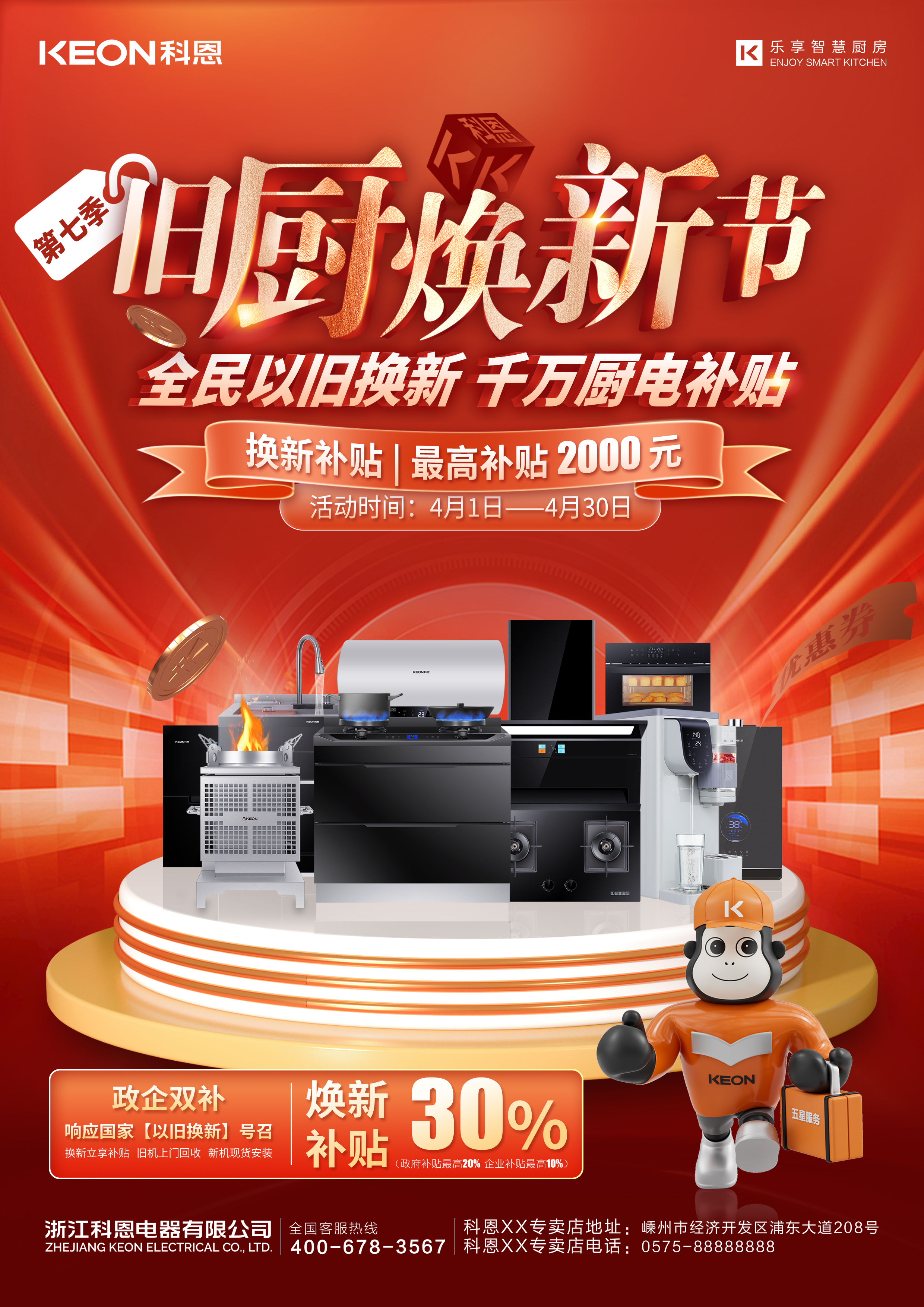 春意漸濃,煙火煥新。科恩電器四月“舊廚煥新節”全面啟動!政府補貼疊加企業補貼,雙重福利最高直抵廚電總價30%,最高可達2000元,更有煥新專享套購優惠,感恩回饋等福利,讓智能廚房一步到位。
