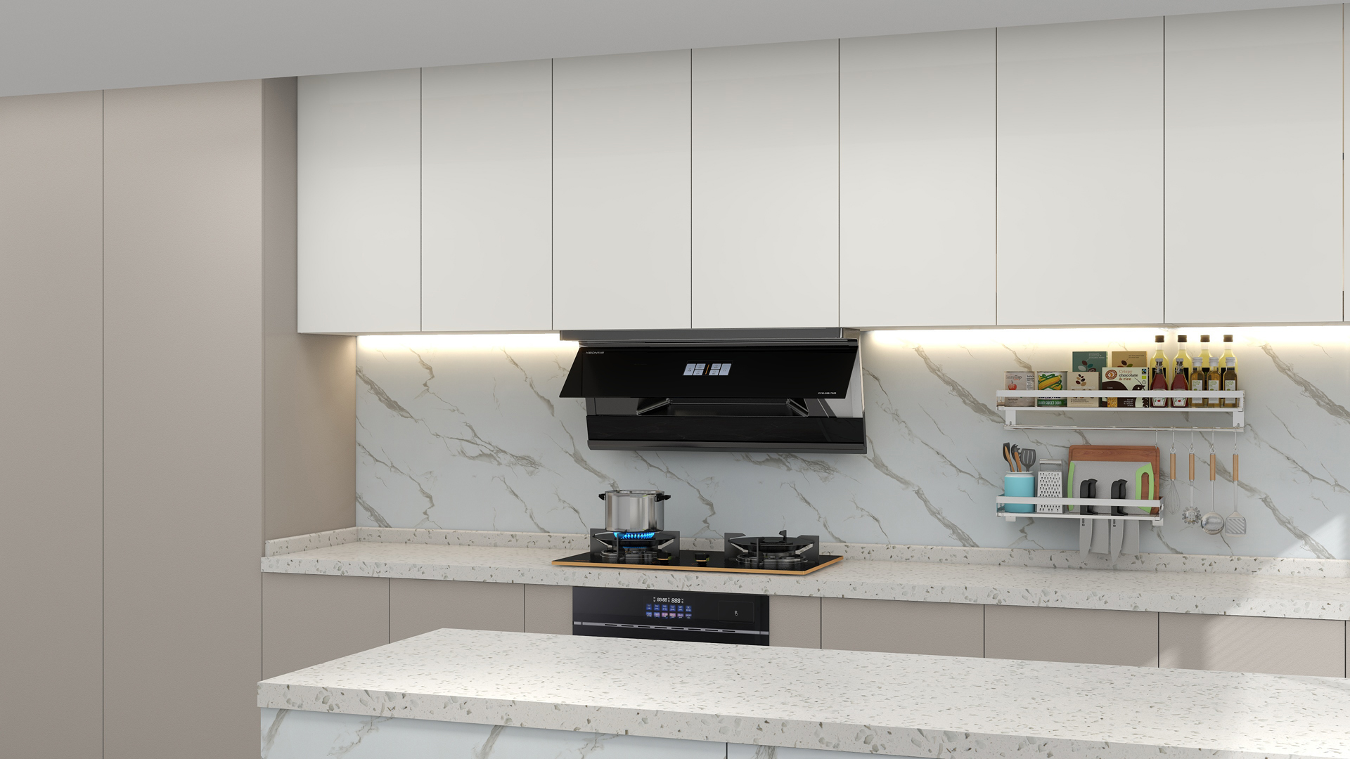 在設(shè)配性上,煙機(jī)7520突破傳統(tǒng)煙機(jī)安裝局限,采用365mm 小圍板結(jié)構(gòu),能夠完美適配多種尺寸的櫥柜。兼顧美學(xué)與實用性,全黑玻璃面板采用一體化成型工藝,不僅視覺上時尚大氣,適配現(xiàn)代簡約、輕奢等多種廚房裝修風(fēng)格,且表面光滑易清潔,有效降低日常維護(hù)難度。操作層面,模塊化觸摸鍵布局清晰,功能標(biāo)識直觀,搭配揮手智控技術(shù),無需觸碰面板即可完成風(fēng)量調(diào)節(jié)等操作,既便捷又衛(wèi)生,滿足了不同年齡段用戶的使用需求。