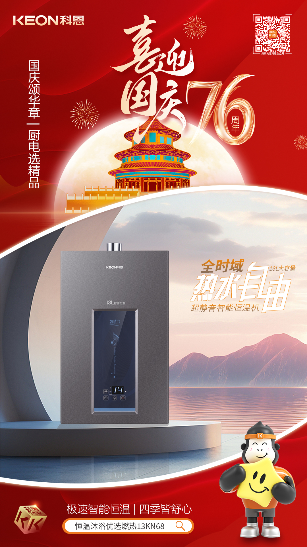 洗浴恒溫相伴,讓假日生活更具品質感。顏值百搭,融入家居美學,高級灰機身,簡約大氣,輕松適配現代廚房格調。分段燃燒技術響應迅速,水溫調節精準不等待,科恩燃氣熱水器13KN68暢享舒適沐浴。金秋沐暖陽,煥新正當時。13KN68重塑沐浴體驗,讓每一滴熱水都精準抵達,治愈長假的疲憊身心。配備極速智能恒溫系統,精準控溫,告別忽冷忽熱。13重守護打造沐浴安全艙,過熱保護+水壓過載雙保險,意外熄火自動切斷氣源,每一項技術都為家人安全加碼,假日歡聚更無后顧之憂。