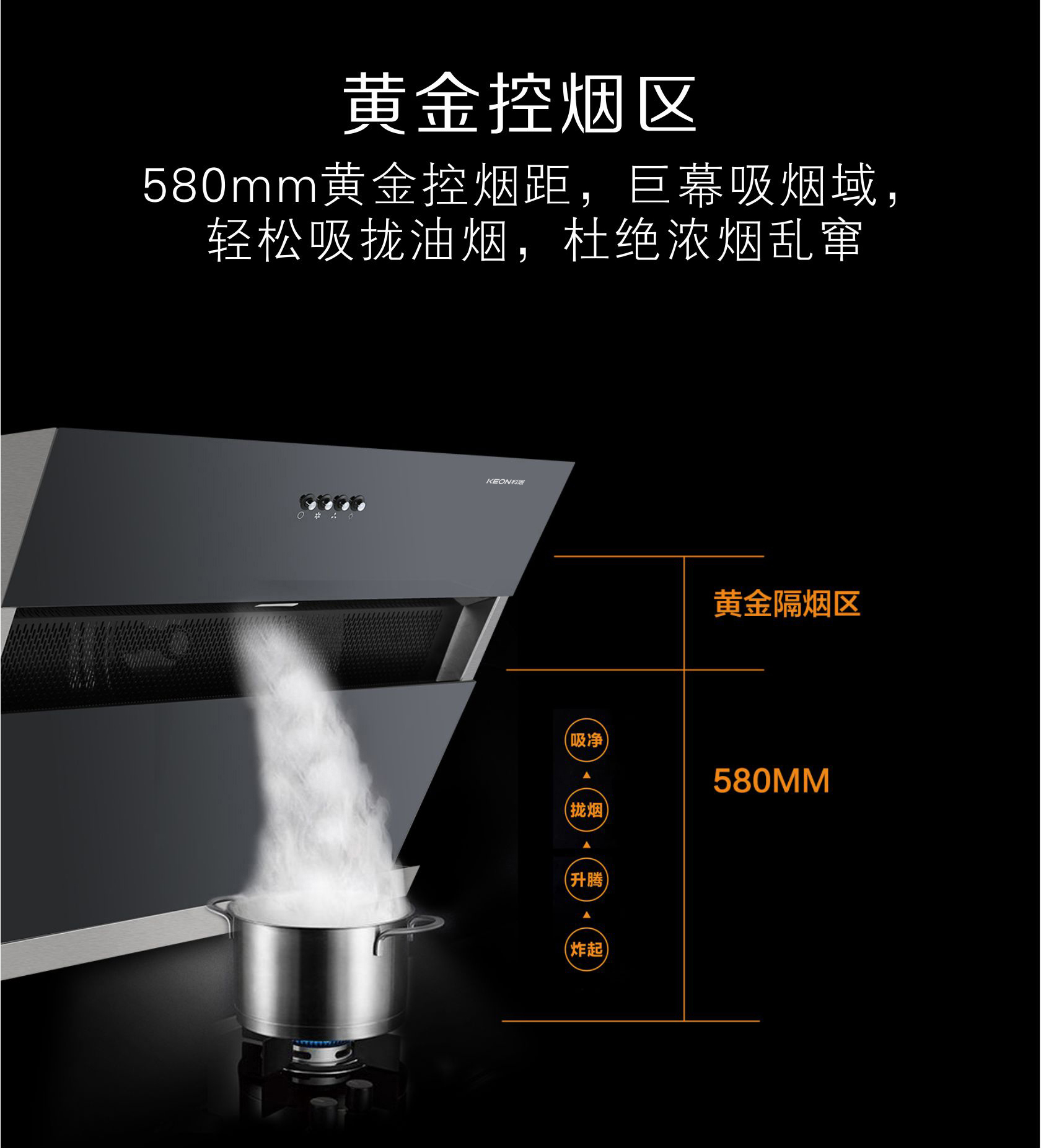 - 580mm黃金控煙距,巨幕吸煙域,輕松吸攏油煙,杜絕濃煙亂竄。