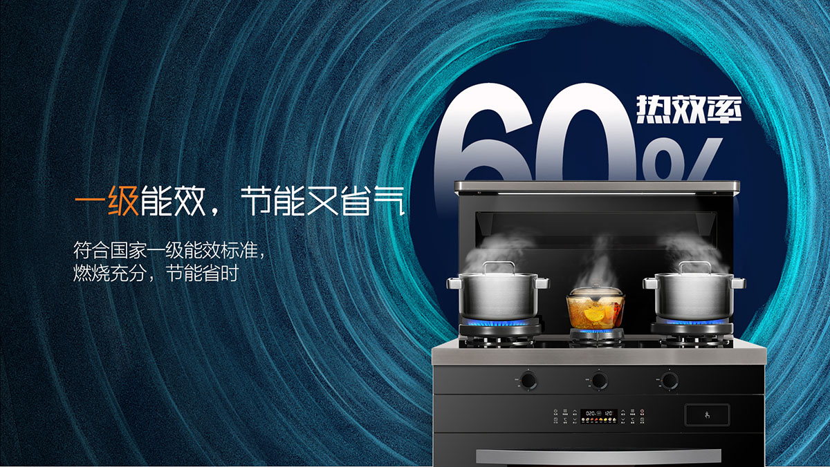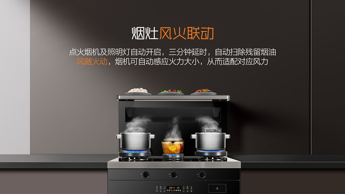 - 煙灶風火聯動,點火煙機自動開啟,風量隨火力大小自動調節