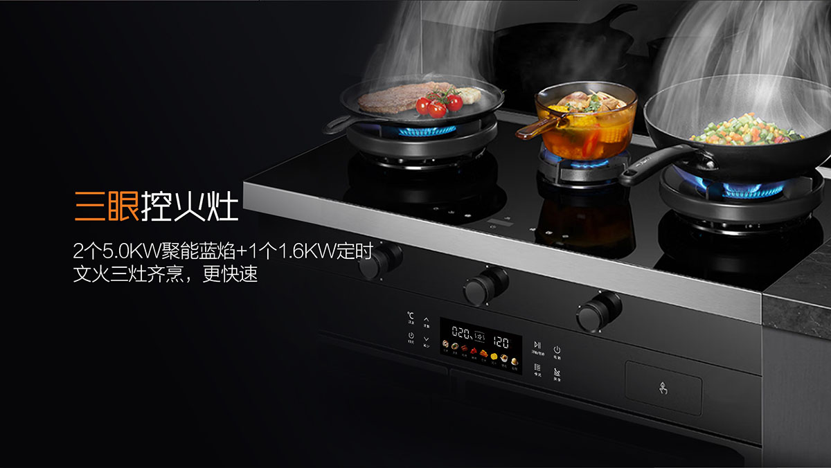 - 三灶同烹,5.0kW猛火爆炒+1.6kW文火慢燉,高效全能,美味加速